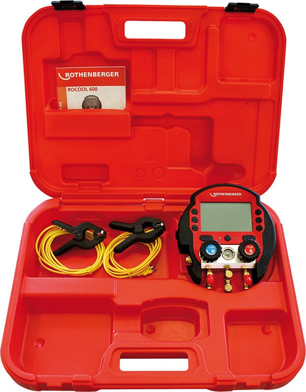 Электронный цифровой манометрический коллектор Rothenberger Rocool 600 (Ротенбергер Рокул 600), 2 температурные клеммы, чемодан предназначен для ввода в эксплуатацию, технического облуживания и составления отчетов по функциональности циркуляционных холодильных систем всех типов.
