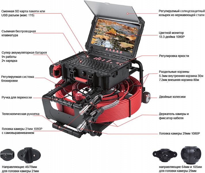 - Головка камеры Ø 29 × 50 мм и проталкиваемый кабель Ø 7,2 мм × 80 м из стекловолокна со счетчиком длины и системой торможения, подходящие для труб Ø 80 – 200 мм, длиной до 80 м